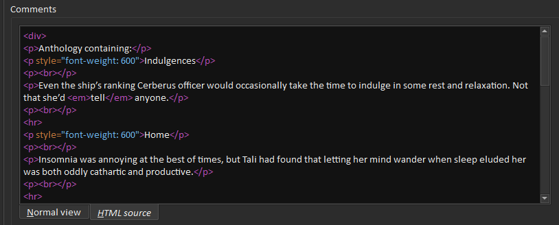 I got stuck on trying to figure out the search-and-replace regexes for it (I wanted to keep url: for in-progress fics) and then forgot about it until now. Last edited by ownedbycats; 09-06-2020 at 01:36 AM. |