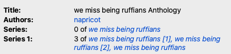 Just to be clear: Series1 works correctly for individual stories in the series, turning up as story 1 of we miss being ruffians, story 2, and so on. ("we miss being ruffians [1]" and "we miss being ruffians [2]" etc.) It's just when I download the work as an anthology that Series1 is messed up. |