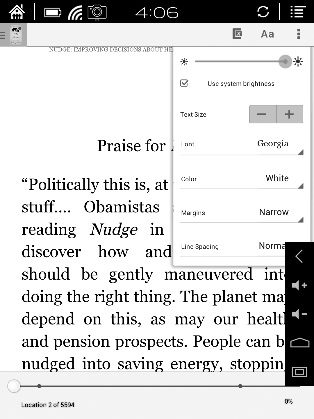 - The Zoom In, Zoom Out and Contrast icons, sometimes are degraded/corrupt - I usually set my contrast to 175, but it doesn't save this contrast between books: it should be a persistent setting - When I set the contrast, I notice there are some words in the lower middle part of the text that are thinner than the rest, this happens in most pages - I'd also like to suggest a setting to display all text as black. When reading PDFs where the text is colored, it makes it much harder to read - The TTS does not work. When I open the sample OReader file and I try to playback the text, nothing happens. When I go to the Android settings, it also doesn't work. But the sound is working. Thanks a lot for a great firmware! :-) |