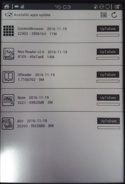 - I am sending a screenshot of the apps update application with the list of applications. - It seems that the old version of Neoreader is not included and I do not know if it is possible to install it. - It seems that old annotations have been deleted or they are not supported in Neoreader2. - It seems that OReader supports epubs, but I did not try it. M |