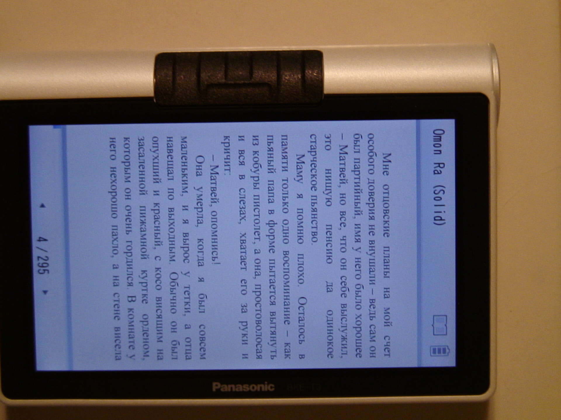 http://sens.boston.googlepages.com/pelevin_omon_ra.pdf http://sens.boston.googlepages.com/p...n_ra_solid.pdf (first built with PrimoPDF printer, second one with Solid, both formatted for Reader and have embedded cyrillic font Times New Roman) Also could you test the battery life at "reading-only" mode? Thanks a lot, man! |