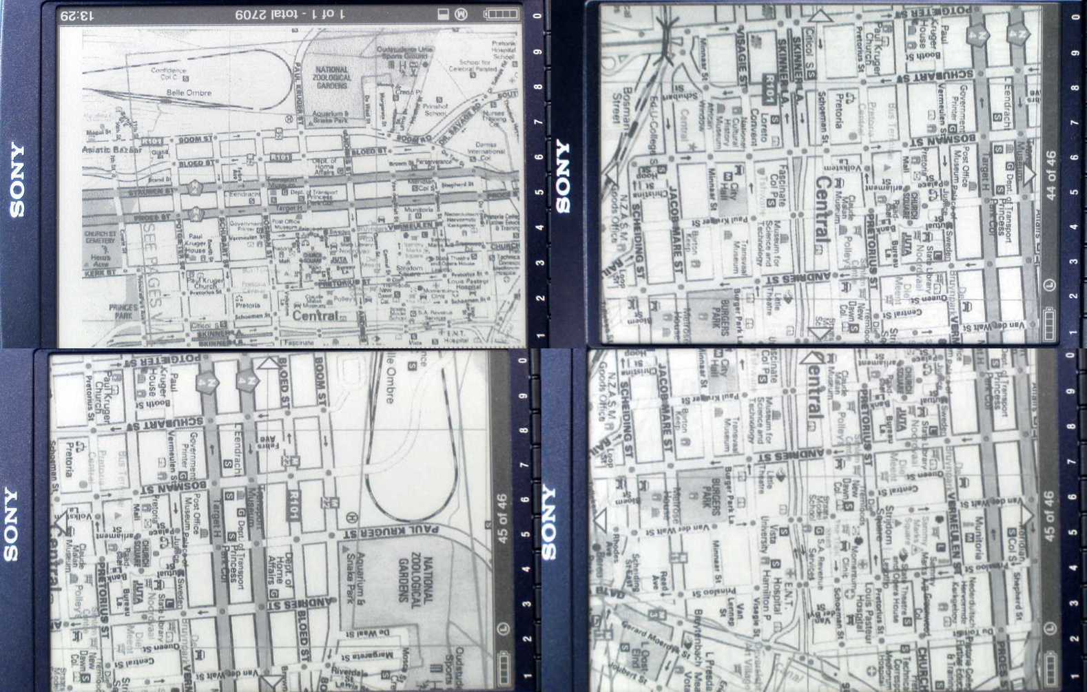 I do not exaggerate in my post title. In version 0.99 pdflrf can output zipped png images of any size and they can be refined to be viewed with probably any portable readers (not just Sony or Archos). For the Sony Reader it means that in can display small print and even city maps. For the Archos it means that it becomes a reader. Pdf reading in Archos is almost useless for the long time it takes to load or zoom every page. Pdf converted to png images can be resized and displayed immediately from its folder page by page. BTW. Cacapee, if the Archos people buy an adopted pdflrf from you (which they should do right now) do not allow them to ask for a buyers' telephone number and e-mail address before selling it (they do it with their plug-ins, which means that my Archos stays crippled because I cherish my privacy). The images in "quick fox" photo are from left to right: 1. the original color pdf 2. lrf by pdflrf 3. like image 2 but splitted in two for maximum size 4. png output from pdflrf (can be panned) The images in "city map" photo are from left to right: 1. lrf by pdflrf splitted in two for maximum size 2. png output from pdflrf 3 and 4. panned image 2 The images in "archos city map" photo are from left to right: 1. pdf zoomed to maximum view (takes 2 minutes to prepare the image and another two minutes to zoom) 2. double size png output from pdflrf zoomed to maximum view (loads and zooms almost immediately, can be panned) Last edited by ereszet; 09-30-2007 at 01:00 PM. |