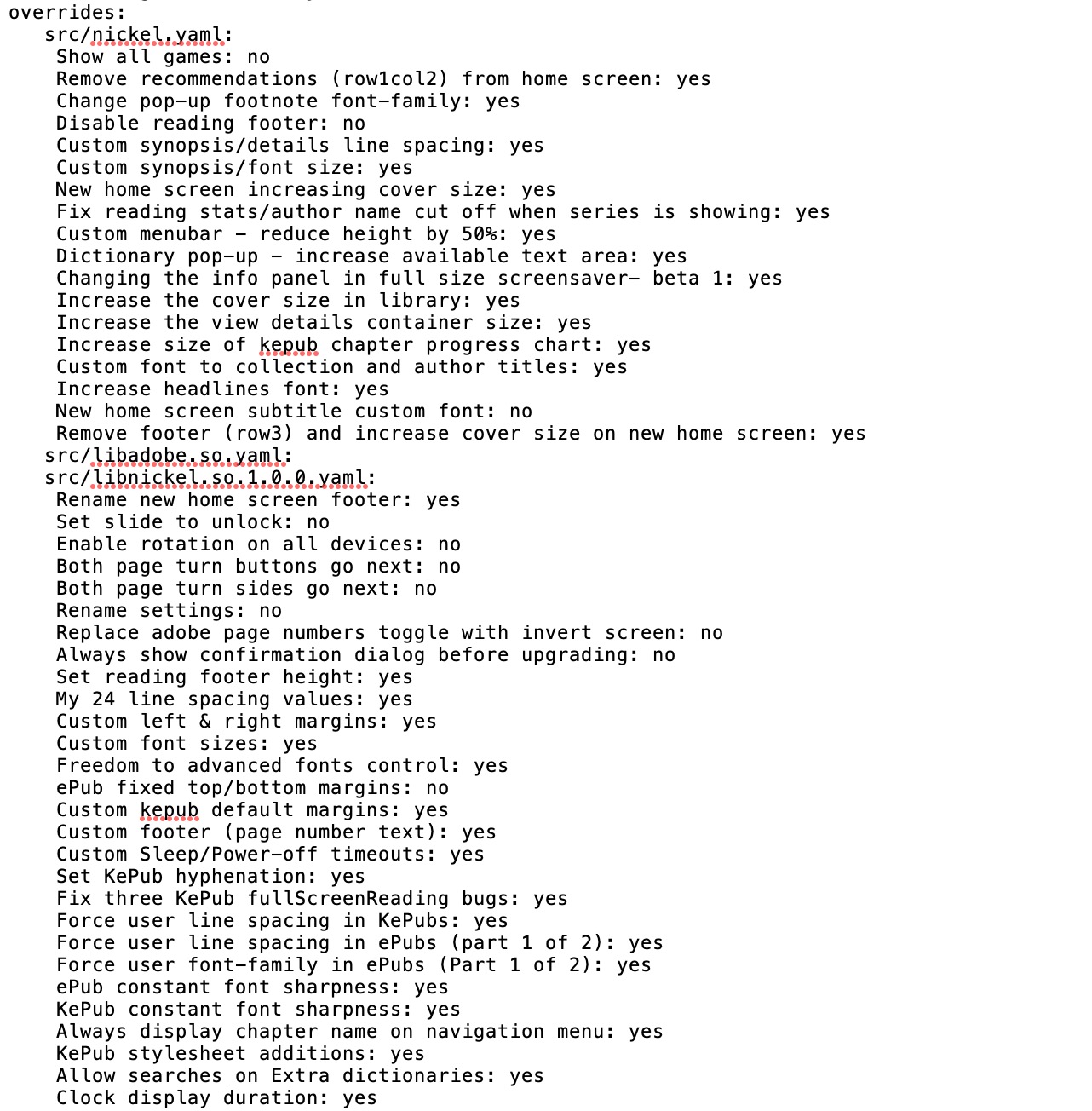 Moving the patch system to YAML and adding the overrides is a great step forward. Now, if we could get a web UI and a cloud service to download custom patched Kobo firmware as a service ... what a dream!