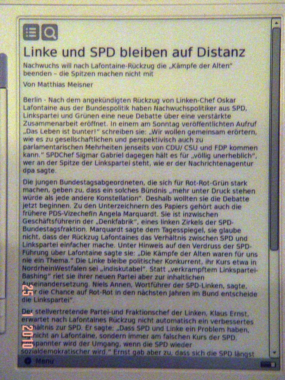 ![]() It's the PressReader application. Choose your newspaper and upload to iRex. It doesn't matter, in which folder you're uploading. It always shows in "News". Sorry again for the bad pics. Pic1: Newspaper style. Hard to read (still no newspaper-sized screen), but you get an idea about the content. Pic2: Here the touchscreen comes in handy. Simply tap into the article of interest. It does reflow perfectly. In the top left corner there are 2 symbols: Table of content and zoom. Pic3: Table of content. Pic4: Zoom, keeping original newspaper layout intact. First impression: Phantastic. I've bought a single issue for testing, which was $ 0,99. About same prices as on Kindle, it seems. But given iRex' touchscreen, it's way more convenient. BTW: You can upload to Kindle and Sony as well, maybe I'll try that later on as well. For Sony 600/700/900 it should be as convenient as for iRex. For Kindle, without touchscreen, I'm a bit less enthusiastic. Very nice application. Only did try it once on iRex 1000S about 9 months ago. Don't remember why I didn't like it then. If only those units would have WiFi to (automatically) download my daily newspaper in the morning, similar to Kindle's Whispernet.... Last edited by mgmueller; 01-28-2010 at 09:08 AM. |