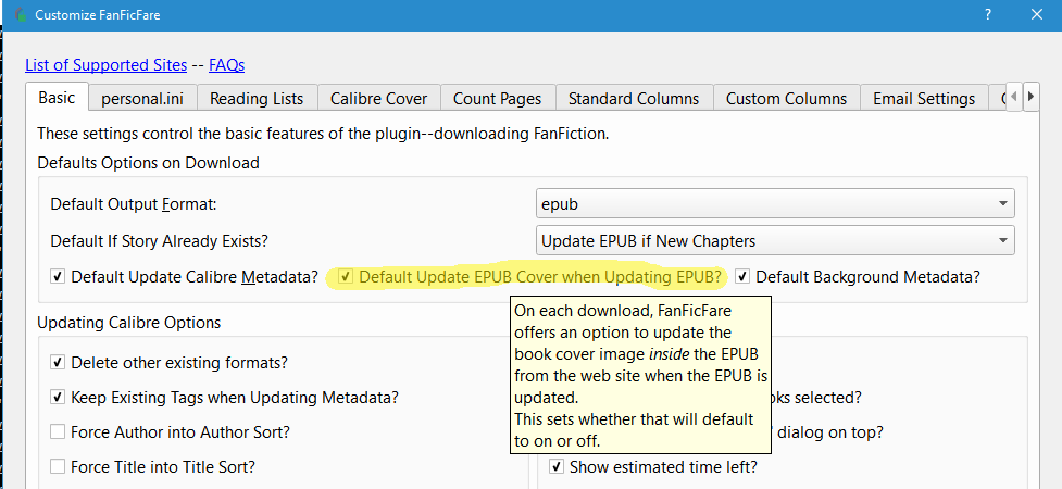 [www.archiveofourown.org] username:**MyUsername** password:**MyPassword** is_adult:true Is there anything else I should have in there to have Fanficfare collect the tags from the stories? Right now I'm going through each story, checking the tags, then adding them into Calibre manually, but since the tags download just fine for the fics that aren't marked "restricted" I'm hoping there's a way to fix this so they'll be added to Calibre automatically when downloaded. |