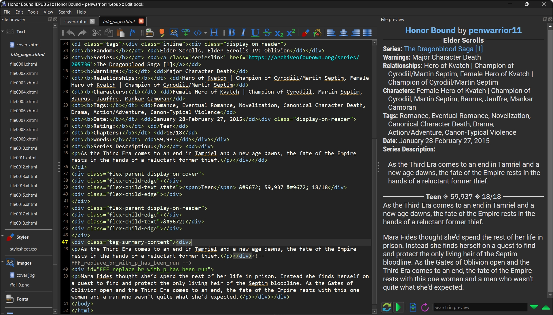 ## Note that this version will *not* remove <br /> tags when a metadata is empty. titlepage_entries: seriesHTML,<br />,category,<br />,genre,<br />,language,<br />,characters,<br />,ships,<br />,status,<br />,datePublished,<br />,dateUpdated,<br />,dateCreated,<br />,rating,<br />,warnings,<br />,numChapters,<br />,numWords,<br />,publisher,<br />,description ## Or maybe: title_label:<br />Title storyUrl_label:<br />Story URL ## ... ![]() Example: Code: