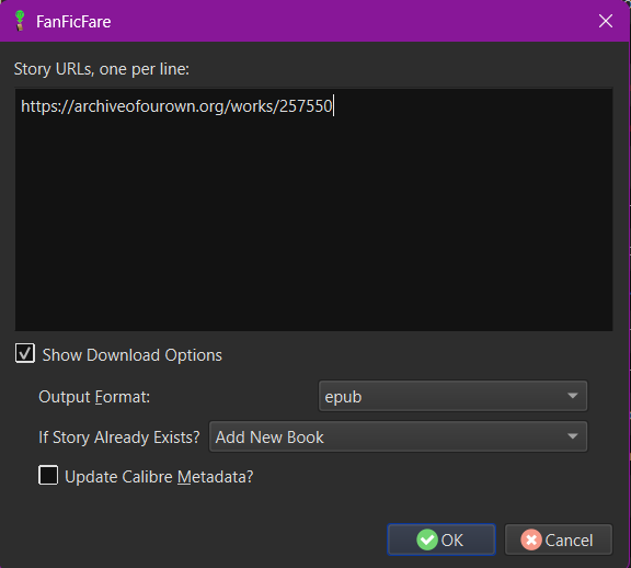 i dont know if theres a problem with fanficfare or i've messed up somewhere (a batch of my metadata isnt working right now and im trying to sort it so my settings are changing pretty regularly depending on if im actually downloading things or trying to test if things work) and im hoping you can help me figure it out. the "if story exists: add new book" option has not been working for me. i have included pictures below, i tried with it updating current metadata and not and got the same result. i have included the current basic settings i am using in case its something there ive messed up, like i said i've been flicking things on and off so i would absolutely not be surprised if i messed up somewhere! if so please help me find it!! if not, i wanted to alert you it might not be working! |