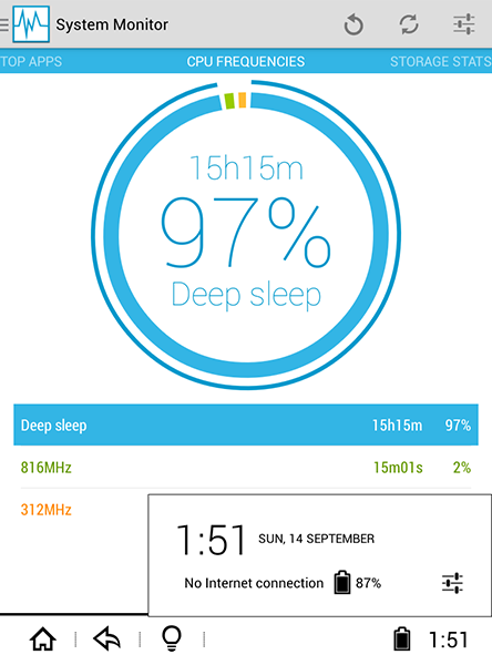 9/12 charged my device 100% in the morning + 30min of reading 9/13 100%. No changes !!! Sleeping mode 9/14 (97% to 87% sleeping mode) problem #3 started. Rebooted my device. 9/15 (87% to 70%) problem #2. I downloaded and tested few apps. 9/16 (70% to 65% sleeping mode). 9/17 (65% to 50% sleeping mode). Problem #3 again. Rebooted my device 9/18 (50% to 39% sleeping mode). Rebooted my device. 9/19 (39% to 30% sleeping mode). Average discharge rate: 1% each 3-4h (sleep mode) Problem 1&3 (1% in 2min) I think my device's battery will reach 0% after 2.5 days (the total: 10 days in sleep mode) Although, I found a way to reduce battery drain (problem #3) by using auto reboot app (each 24h), I could not find a way to solve other battery drain problems. From my point of view, the cause of these problems is the software (android build & kernel build) because many people reported a bigger problem in battery life before the latest update. BOYUE & Icarus's OS developers have to fix these problems .