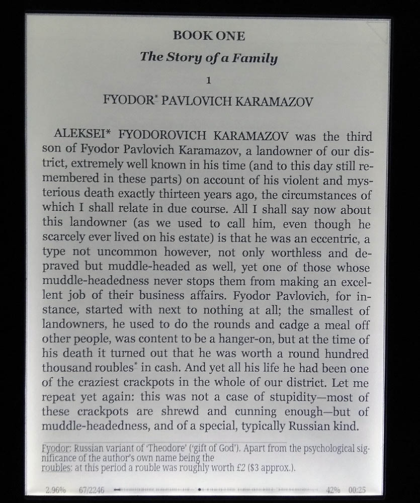 Even though it might not be apparent in the pictures, text on the t1 looks slightly blacker than text on the i86. In terms of the whiteness of the background it wasn't as easy as I thought it would be to tell the difference. As soon as you turn off the LEDs, it requires some close inspection to tell which of the devices has the whitest background. On the three, the background of the paperwhite is a hair whiter than the backgrounds of the i86 and the t1. |