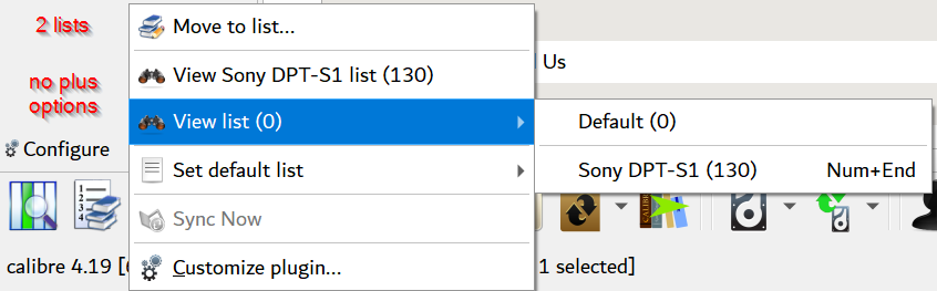 The ReadingList menu only has two states--when there's only one list and where there's more than one. I assume the more-than-one state is what you mean by 'plus options': You seem to be suggesting that you are sometimes seeing a third state between the two when there's 2 lists? If so, can you show me some screen captures of what it looks like and, ideally, a Calibre debug log from when it happens? Calibre->Preferences dropdown->Run in debug (The debug log also tells me about your OS & calibre versions, etc.) Minor point, but sure; that's easy. Already added in my code, so it's already hidden in the screen cap above. |