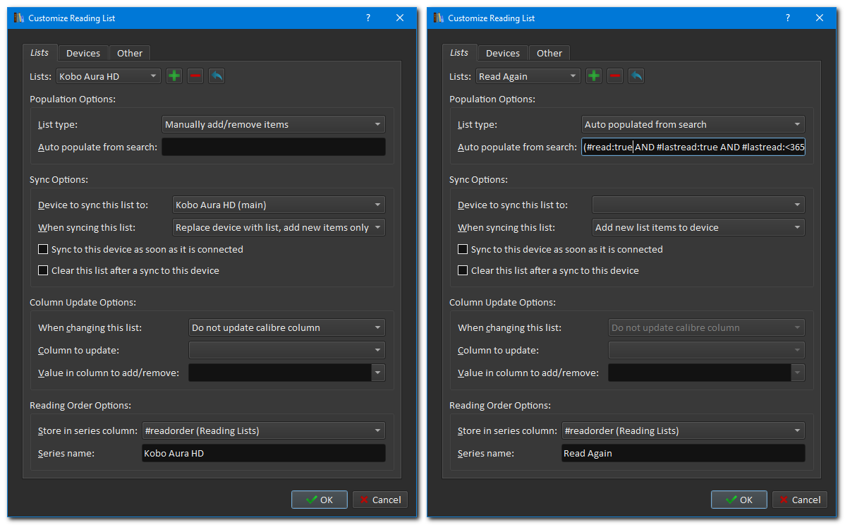 IE, search auto-populated lists don't change it (as reported), but neither do device auto-pop lists and if a manual list is cleared by auto-sync, that doesn't change the configured series column either. (Semi-related: Due to the fact that an search auto-pop list is only refreshed when the list is viewed, the book count shown in menu for that list is also likely to be off.) I'm not interested right now in trying to puzzle out all the different interactions to try and make this work. I might spend some time on sorting out the mess that is enabling/disabling other settings in list config. But don't hold your breath. |