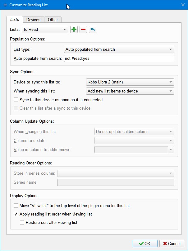 The best case scenario would be that as soon as I connect my device, it initiates a sync and moves all books from my library that doesn't have a Yes in a custom Yes/No column (called "Read") over to the device. While at the same time, it removes finished books from the reader and adds them to the "Read" list that is tied to the custom "Read" column. Is that possible? So far I have the column set up and linked it to the plugin. But I have to manually add new books to the device and manually add books to the "Read" list. Any help is greatly appreciated! |