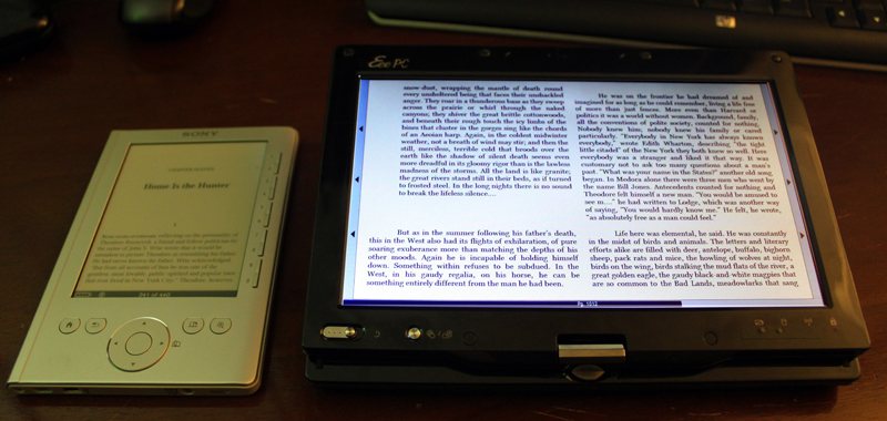 THE SOLUTION WAS THE INTRODUCTION OF AFFORDABLE TABLET NETBOOKS The solution that worked for me was the introduction of affordable tablet style netbooks with touch screen technology. A few have already made it to the market. Currently they are a bit pricey, but as more models reach the market the competition should not only lower the prices but increase their usability by providing more horsepower with longer battery time. ASUS T91MT TABLET NETBOOK After doing some Googling and research I found the Asus T91MT, a 2.1 lb netbook with a 8.9 inch display. But instead of the typical clamshell design, Asus made the LCD screen capable of being rotated and folded back onto the keyboard to form a tablet netbook. (See photos below.) They added a resistive touch screen that is very responsive to fingers or a stylus. The result is a device that makes a really great eBook reader and has full computer functionality. I'm not suggesting you buy this model, but I am suggesting that you buy into the form factor--a netbook tablet running Windows (or any appropriate OS for which eBook reading software is readily available). I spent a little less than $500 for my Asus T91MT--about the price of the lowest end iPad. As stated I bought the T91MT and then set out to turn it into my ultimate eBook reader. STEP 1: The first thing I did was to increase the RAM to 2GB, the maximum allowed on this model. This was the only additional cost, and it was about $40. STEP 2: I uninstalled a lot of the OEM software that I would never use but that runs in the background or starts up automatically when the computer is turned on. All PCs come with this extra baggage and it does little more than slow down the system. STEP 3: I ran MSCONFIG and turned off any unnecessary services which only serve to slow down the system. I also unchecked several startup items that don't need to automatically start every time you turn on the computer. You can uncheck anything from Adobe or Apple. Anything else you can Google to see if it is needed or if it can safely be unchecked. You will be amazed at how much this will speed up a marginal system like a netbook. STEP 4: I installed all the eBook related software. You be the judge here as everyone has their own preferences. But here are my preferences. MobiPocket Reader. FREE. This is my favorite. It is highly customizable and works well with .mobi and other formats. FBReader. FREE. This is one of the best ePub readers for the PC. Kindle for PC. FREE. Not very customizable, but you can download and read Kindle eBooks. eReader. FREE. This was originally written for Palm PDAs many years ago. The reader is pretty good on the PC and allows you to read .pdb and .prc eBooks. It is the program on which the Barnes and Noble Desktop eReader was based, but it is better than its successor both in functionality and in the interface. Adobe Acrobat Reader. FREE. Highly recommend for PDFs. A bit bloated, but still a great PDF viewer. Far superior to Foxit Reader when rendering in portrait view, and about the same as Foxit when rendering in landscape view. Foxit Reader. FREE. An alternative for PDFs. Though certainly less bloated than Adobe Acrobat Reader, it cannot compare with Acrobat's portrait view rendering. However, landscape view rendering is on par with Acrobat. Calibre. FREE. The reader is not very good, and you probably won't need the sync function since you are using your PC for a reader. However, this is must have software for converting non-DRMed eBooks to other formats. It is also good for changing metadata and improving the formats on non-DRMed eBooks. Sony Reader Library. FREE. This is terrible software, but you might need it if you have a Sony Reader. Otherwise I do not recommend it. Barnes and Noble Desktop eReader. FREE. This is nearly as bad as the Sony Reader Library. I do not recommend it. Stanza. FREE. This is the worst of the readers. It requires the Java Runtime Environment, which slows down a netbook to a crawl. The interface is elementary and not conducive to tablet mode. And rather than using pages it scrolls through a section like an HTML page in a browser. I do not recommend it. I also highly recommend a good office suite such as Microsoft Office 2007 or Open Office. Your netbook probably comes with an office suite installed, at least a trial version. If not and you don't want to purchase MS Office 2007, you can always download the free readers. PHOTOS OF MY ASUS T91MT TABLET NETBOOK AS AN EBOOK READER The following photos show my ASUS T91MT along with a Sony PRS-300 for comparison. I'm running MobiPocket Reader in The photos. NOTE: These photos really do not do justice to the Asus or sony screens. Both screens are much better looking in real life. Last edited by jswinden; 02-21-2010 at 04:58 PM. |