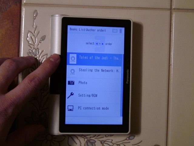 I finally got my hands on the extremely elusive Panasonic Words Gear BKE-T3. I'm going to definitely write up an extensive review of the device for several reasons; first and foremost, because there isn't a hands-on review out there and secondly, because there's a lot someone needs to know before picking one up.I'll start by telling my adventure in finding and actually getting my hands on one of these puppies! As you all know, I've been hot to find a Words Gear since I saw the yvanleterrible referenced one a while back and I saw the impressive video. Marketing hype has been stating that ebooks are selling like hotcakes here in Japan, but after finally nabbing one of these, I know that's all BS. To begin with, if you even want to find an eReader you need to do some major legwork; there aren't any on display anywhere I've looked in Tokyo. The one I finally found was in part by help from friendoffun and the Words Gear marketing website, which had a list of all retailers that carried the device throughout Japan. I spent a lot of time trekking all over Akihabara looking for one, nobody there had any clue what one was, let alone where to find one. I was referred to a bookstore by one sales person and another said I'd need to order one online! This is extremely funny in that credit-cards are not a large commodity here; i.e., only maybe 1 in 50 carries a CC, where others simply use their cell-phones as charge mechanisms. After that fateful visit, I went home and found the list of sources, so my friend called the bookstore, Kinokuniya, in Shinjuku to make sure they actually had them there. She was informed that they had some and even had a demo unit. I was off. When I actually arrived there I decided to try and find the demo unit so I could spare trying to have someone talk to me in English... eight floors later and not a one in sight! On the foreign books floor I found a stocker and asked her where they might be, two minutes later and she came back with a "What the heck is it?" and "We don't have 'em here." I assured her they had, so she went back and spoke with the floor manager and came back a few minutes later with another negative. I told her my friend had called the store and found they had a few, so I was quite sure of it. A few minutes latter she returned, apologized,and directed me to the third floor (the computer book section). Again, I wanted to see the demo unit, so I scoured the floor... nada. I went up to the cashier to ask and the attendant produced a plain brown box with an SD-card attached to it and a flier. I asked about the demo unit (I really wanted to try it out before I took the plunge), she said "Nope, don't have one." I tried the whole "My friend called spiel again," and was given a definite "No." So, I asked what their return policy was, since I wasn't even sure if I could use the device for what I intended, let alone use it if it was all in Japanese. What appeared to be the floor manager told me there was no return policy for it, only for books(!). I asked him if he was sure of this and he said yes (actually quite rudely for a Japanese person, so it kind of put me off since I was being totally friendly since I was excited about actually finding it). I decided I'd pick it up even though I was warned it might not suit my needs; it cost 41,290 yen, or roughly $350. I don't mind this so much since I can't use the yen outside of Japan and the cross-conversion rate would make you weep.So, here I was yesterday with my shiny, new Words Gear. I held off until I got home and popped it open to check it out. A short rundown of initial impressions and a longer review tomorrow (it's 6:00 am and about time I went off to bed, been playing with the darn thing all night!). To begin with, it's quite a bit thicker and much heavier than the Sony Reader, while they advertise the screen being 5.xx inches, it's a lot skinnier than the Reader so it doesn't have near the screen real-estate. The battery/grip area is like holding a roll of quarters, it's that thick. The navigation pad is a bit unique and useful, but takes a bit to get used to. There is no internal memory short of where the OS is installed, so you'll need to provide your own SD-card (nope, no other types accepted here... and for a reason). It doesn't come with any type of case, though the manual shows you how to put it on, if you buy one! All access areas around the device are cover with dust caps/tabs; I'm a little nervous about this in case their joints ever wear out and fall off. The actual screen is a backlit LCD, actually the nicest feature; it looks really nice! Best of all, Panasonic/Matsushita saw fit to include an English language option for the underlying controls... what a relief! Lastly, the included SD-card, a mere 128MB(!), has about 25 free books on it, none in English and no manga (kinda hoping for this just to test the display compared to the Reader). The books looked pretty nice on it and so did the first few photos I tested. Anyway, I have much more to write but I'm too tired for now. Needless to say, I have some major gripes and a few tricks I worked out to make it work for me. Still don't know how to get PDF's to work on it yet, so if any Japanese readers want to hit up the website and see if they can tell me, that would be wonderful. I'm a little nervous as I saw a page talking about some PDF add-on you can by for about $12, though I'm not sure if it's required. More to come...
