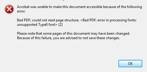 I thought saving it to HTML first might improve things by separating the images from the text, so I fired up Adobe Acrobat and tried to save it. No joy. Acrobat gives me the error shown in the attachment. I don't know if this would cause your problems, but it certainly prevents acrobat from correctly saving the document. Can the original source be printed/saved to something other than PDF? For example, can it be saved to rtf or html? PDF is notoriously difficult to deal with. |