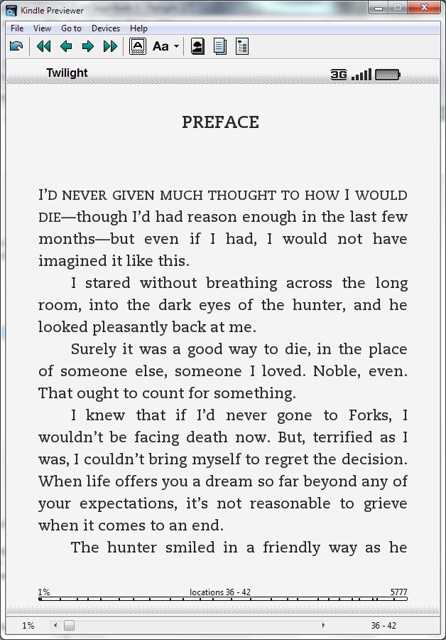 doesn't workwith the newest calibre I still can change the title to whatever I like, it shows as "Twilight". I didn't check in my kindle yet, but the kindle previewer does pretty much the same job. I think it has something to do with the database name. Attached the same file, shown in previewer and the metadata in mobi2mobiGUI - in the "window in the window" you can see as first line Database Name: Twilight. BTW, the file is the updated metadata-file as saved in my calibre library - not the original imported file. Last edited by bear4hunter; 07-10-2010 at 03:37 AM. |