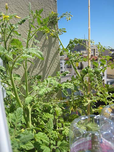 ![]() I've been preparing my plants for the holidays. My wonderful and irreplaceable concierge has agreed to come and water them when I'm gone. I set up lots of plastic bottles screwed on ceramic cones that are supposed to let water seep through as needed. I'm pretty sure I have too much irrigation now that the weather is milder, but I don't dare reduce it, what if there is another heat wave? I'm busy eating all of the rocket before I leave, and I have torn down the two oldest plants that had flowers already, to sow some more in their place. I don't know if that's going to work, maybe all the nutrients in the soil are used up already? To attempt to compensate I put a couple of fertilizer sticks in the soil. One of the tomato plants is growing lusciously, the others are less exuberant but they all have fruit now, and flowers still. I love watching the bees browse them. (Is that really the correct term? It sounds weird )