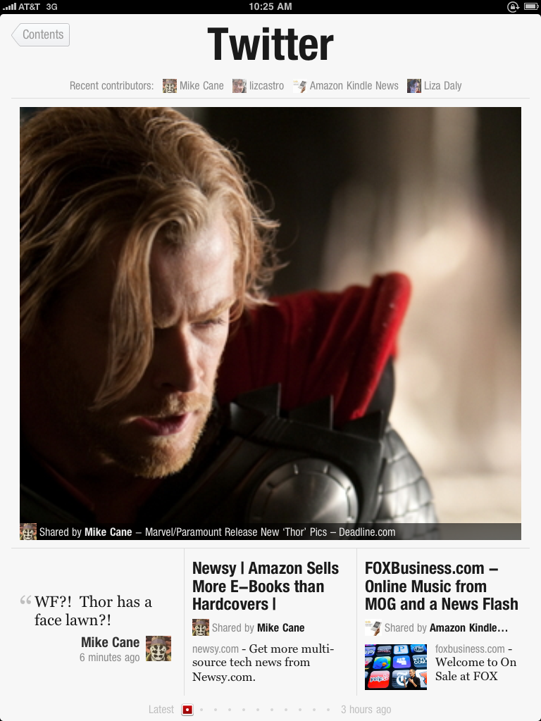 This is very nice. I managed to get one Twitter account hooked up to it after repeated attempts. Feels very much like a magazine with tweets living alongside linked articles complete with photos.