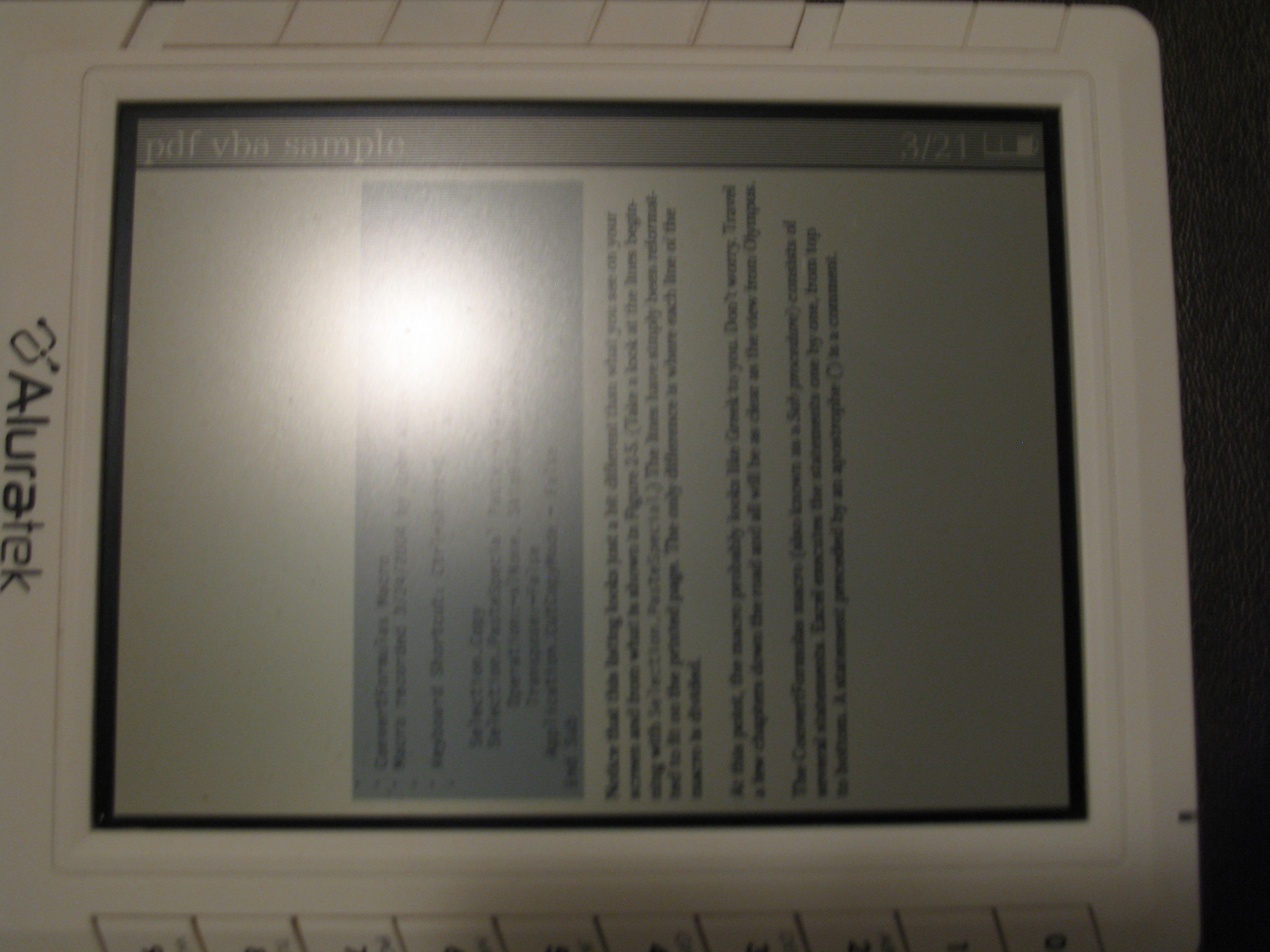 The typical advice is get an Ipad but it's still very pricey and otherwise would have to wait for a newer device. I was considering this (a libre actually) or a kobo. If anyone can look at this (or maybe even take a pic with a camera!) on the their jb/libre it would be greatly appreciated. It's a small section of a vba book, that has had the pages split (with sopdf) and then I chopped out just a few pages of it. IF anyone could tell me how good (or bad) this is in landscape mode that would be great. Stuff like readability, is panning needed from side to side or does it just fit. sopdf seems to vary in how wide it things a page is sometimes so I'm curious if that throws off going from page to page on a reader and always having to recentre. I'm thinking on either getting this today, or a kobo, or the cinpal pmp and convert all my pdfs to jpgs, or just holding off for a more appropriate device. However, I have a need for this type of device now and might just get one anyway as they are relatively cheap. But if it's a total bust with pdfs, why waste the money. |