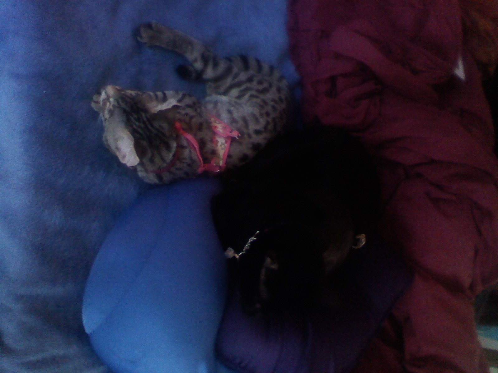 after yesterday's comedy of feline errors and unauthorized cat circus I decided to put them in their harnesses and just have them hang out in the house. Strider thinks it's fun to undo the back part of Arwen's harness *sigh*