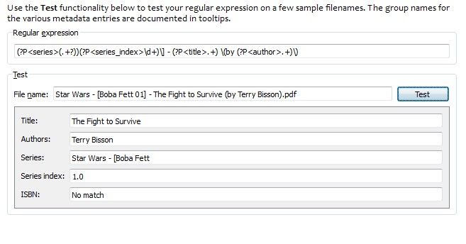 Star Wars - [Boba Fett 01] - The Fight to Survive (by Terry Bisson).pdf The Output I would like in Calibre would be: Book Title: The Fight to Survive Author: Terry Bisson Series: Star Wars - Boba Fett and then the #1 for the sequence in the series. Is this possible via a Regular Expression?