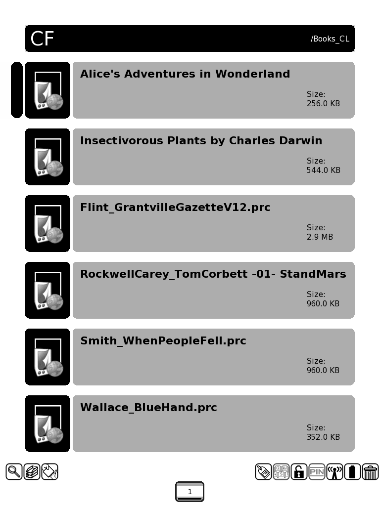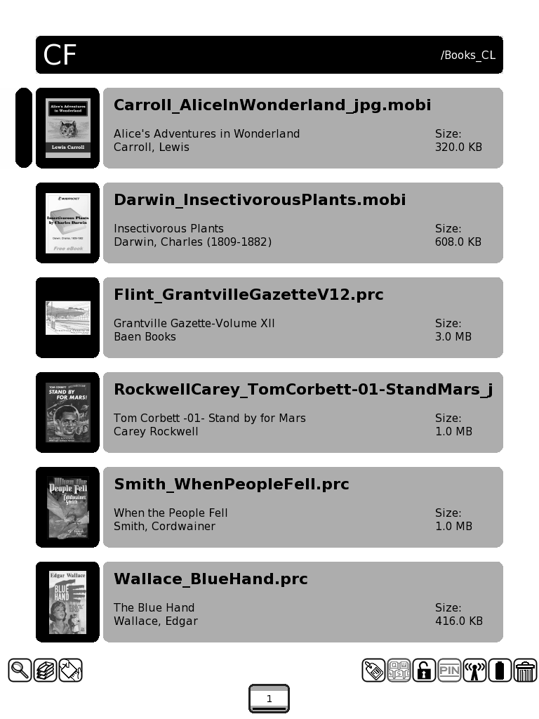 The 1st shows files that have been copied to the CF card, but not opened. In some cases the contentLister lists the book's title but in other cases it lists the books filename. The 2nd shows what happens after the files have been opened by the MobiPocket Reader. They are now in individual subdirectories, and in all cases the contentLister lists the books filename (which is also now the subdirectory name). This is because that is how the MobiPocket Reader has configured the manifest.xml files. The 3rd illustrates what manually editing the manifest.xml files and adding a cover image can do. I left the filename as the title, and added the book name and author in the description field. There are obviously other possible layouts. It is a shame that there isn't room for a 3-line description. The thumbnails look better in the screenshot on a large desktop display than they do on the iLiad. This is one case where color would help a lot (much more than with larger images). Still, I think they are an improvement over the current default. Note that all this information, including the cover image (in most cases) is in the .prc or .mobi file. There is no reason why the MobiPocket Reader could not produce a layout like the 3rd screenshot instead of the 2nd screenshot. As usual, depending on your browser defaults, you may need to click on the expanded image again to get the full sized screenshot. |
