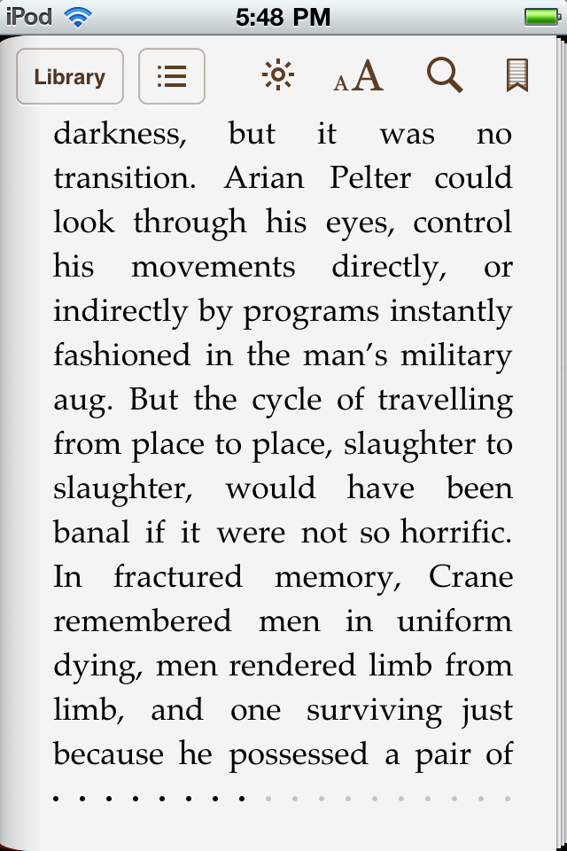 Stanza in particular has lots of customizing options in terms of font size and text and background color. I find that for text only, and particularly for "light" reading, the iPod works great. For books that require more concentration, I find my concentration broken by the need to frequently swipe to the next page much more often then I'd have to turn a physical page or change screens on a larger device. I have one book that I tried on the iPod, but stopped and am saving it for when I have an iPad. But for casual, pleasure reading, I find the iPod Touch perfectly functional. While a bigger screen might be nice, then it wouldn't fit in my pocket, so I'd have it on hand in fewer situations. Once upon a time I always traveled with a book. I had gotten out of that habit for a while as I tried to pare down the number of items I was taking with me everywhere, but now I can travel with 50 books on me at all times with less bulk then the one book I used to carry. I like it just fine. |
