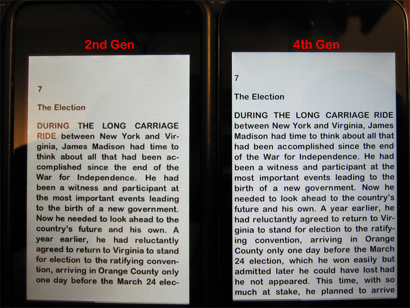 I just got a 4G Touch and own a 2G as well. The 4G has a much sharper screen but I couldn't call it huge advantage over the 2G. In iBooks, at the smallest font on the 2G paring with the 4G (which has 2 smaller fonts one is really, really small) I really couldn't see that much difference both are readable. The newer model has a better white background which helps.