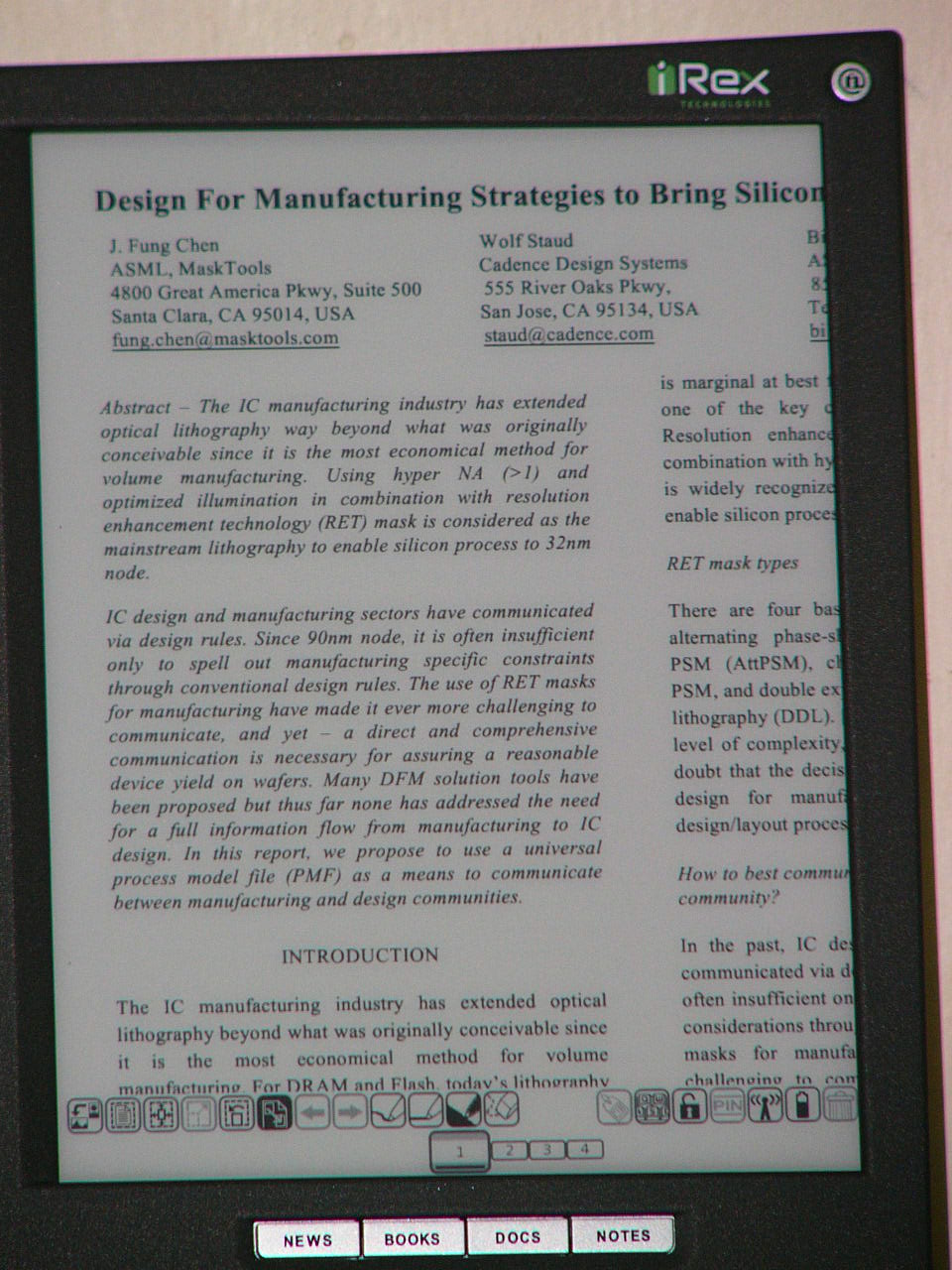I did not really remember feeling so excited when I previously got my PRS500. On the contrary, after playing it around for a while, I already have this sinking feeling that it is not going to work well for my pdf files, especially the 2 column technical papers. I was right. It is sufficient for light pure text reading but not for reading pdf books. Even RasterFarian did not managed to solve the issue. It is good but the conversion takes time and to convert all my pdf books to lrf format would take an enormous amount of time. Cutting the 2 column format to multiple pages is not going to work, what we simply need is panning...Iliad solved the problem beautifully, way beyond my expectation. Pdf loading is fast in my opinion. Here are some numbers: === Statistics for firmware ver2.11 === Startup time : 51 seconds Loading time for 29Mb text+some pictures pdf file : 22 seconds Loading time for 35Mb graphic intensive pdf file : 18 seconds Both files were loaded from a 1Gb SD card. What I like about the Iliad: a. Good zooming (see the pictures) b. Fast load time even for huge files c. Since it is pdf, fonts can be embedded and so Asian languages are not a problem (see pictures) d. Able to do panning using stylus e. Nice design with the flipbar f. The notetaking feature is awesome! g. Big 8" screen h. I do not even need to spend time resizing my A4 size pdf files. The pdf files in the pictures shown are all of A4 size. The only thing the prevents the Iliad from becoming the perfect device is the lack of an official browser. Although Dillo can be installed in just 3 simple steps, it does not display the webpages well (as can be seen in the pictures). Also, yahoo mail and gmail does not work with Dillo. The installation steps in the wiki is slightly outdated. It can be easily installed as follows: Step1: Get the developer's package Step2: Download the file dillo-0.8.6_iliad-0.7.zip (created Apr 2007) & connection-scripts-1.0.zip (created Mar 2007). Then unpack it on your harddisk. Directories "dillo" and "connection-scripts-1.0" will appear. Step3: Copy the 2 directories to your MMC/SD/CF card. Installation is now complete. How to use: Access your MMC/SD/CF card from the device manager. First click on the contentlister entry "connection-scripts-1.0" for starting LAN or WLAN. Then click on the contentlister entry "Dillo Web Browser" for starting dillo. Notice that I did not say the directories can be copied to the main Iliad memory. For some reason, it always gives write error. Have not figure that out yet. The Dillo display problem can of course be easily resolved by switching to the Minimo browser. (Hey Adam, where's our nice package? )Some info for the still undecided: 1. When reading, wifi and touchpad functions are used together, the Iliad can still manage to last for at least 5 full hrs. 2. It has an onboard memory of about 128Mb. So an external card is not absolutely necessary. 3. It can be recognized as a usb device. Simply plug it into linux or windows. Hope that the above info will be of help in giving that final push to buy it. The Iliad is definitely worth every cent of its price. When doing the purchase, there is a point to note though. It does not come with a protective jacket so it might be good to get a jacket together with the Iliad.Best regards Quek |