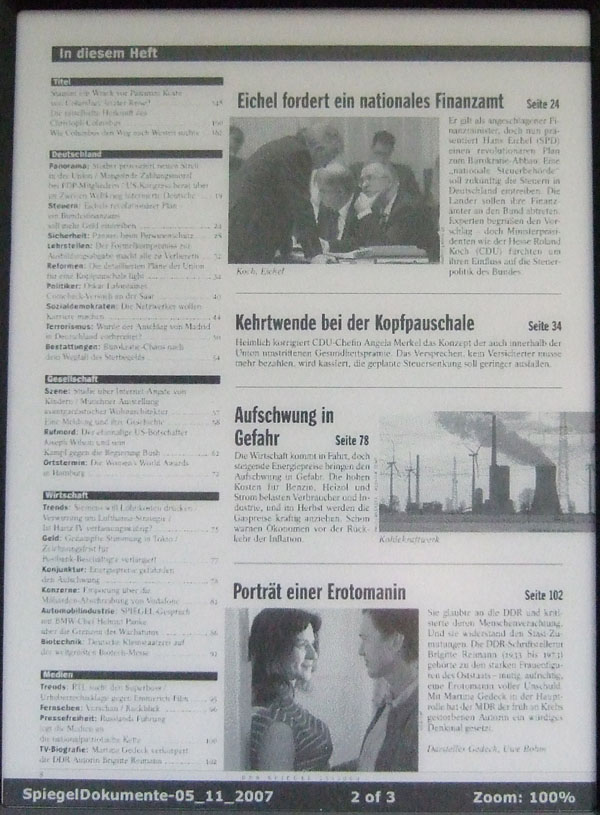 The pdf contains the index of a digital edition of the Spiegel, which is one of the newspapers i'd like to read at this device.