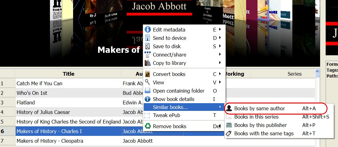 Another way (Calibre has many ways )Right click on one of the books you want, Similar Books ... Author, Series.... (See what I mean about many ways?) |