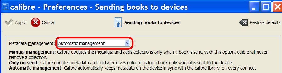1) Your reply didn't make it clear whether you tried changing the device customization that dwanthy pointed you at. If you did, and if you are running 0.7.20 or any release before, you won't have joy. Custom columns as collections was added in what is currently called the 'calibre beta' (the sticky at the top of the forum). This version will likely become the production release at the end of this month. 2) If you have set metadata management to automatic, then I would expect calibre to delete any collections you made on the device. Zap ... Gone. It would then add collections based on the device customization. If you set metadata management to manual, then you might get part of what you want. Your hand-edited collections would not be deleted. if 'by accident' calibre uses the same collection name, then calibre's changes would be merged into the collection. That said, there are significant downsides to this. The first is that metadata changes in calibre's library will not be sent to the device unless you send the book again. The second is that the 'connection' between calibre's collection and your hand-edited one is accidental and may not continue to work. Bottom line: calibre offers two approaches to collections. Automatic management means that calibre owns the collections and do whatever it wants. Manual means that the device owns the collections and calibre will tread lightly. The other one, on send, is middle ground; calibre take ownership of collections for a book during the moment that the book is sent, then cedes it back to the device. |