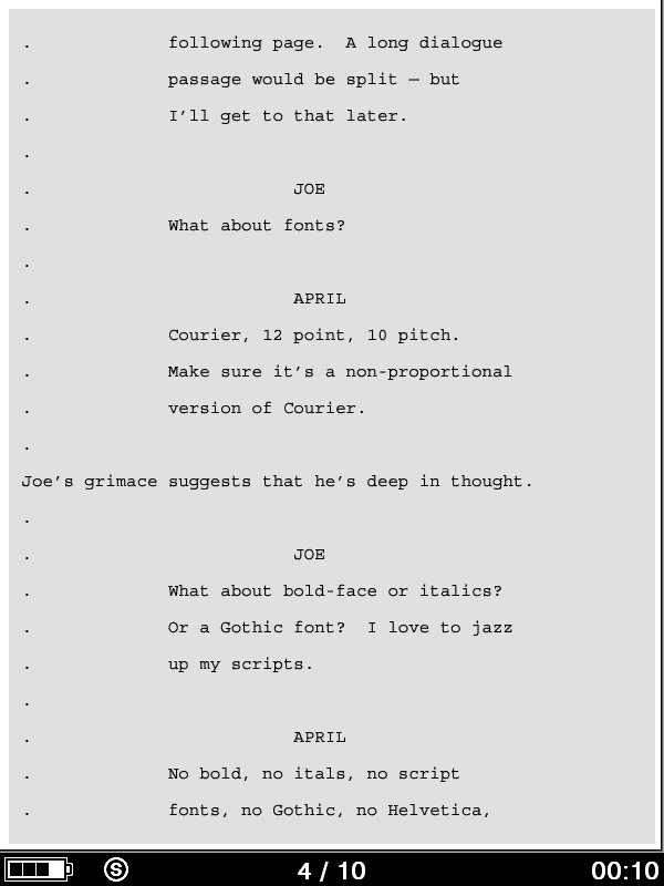 Does anyone know if there is any flexibility on the PDF import routines when the file format is unusual (ie not like a book). Film scripts from Final Draft and other film / tv screenplay tools have a very highly defined format which I'm sure if one could find the right place in the process to work on would be easy to analyse as it is so different. For example centered dialogue and character names in capitals, left formatted descriptive passages and left formatted capitals being scene names. Quite a small number of conventions define the way a script is formatted but so far finding a way to convert a screen plat / script onto a Kindle 3 has proven less than satisfactory or consistent