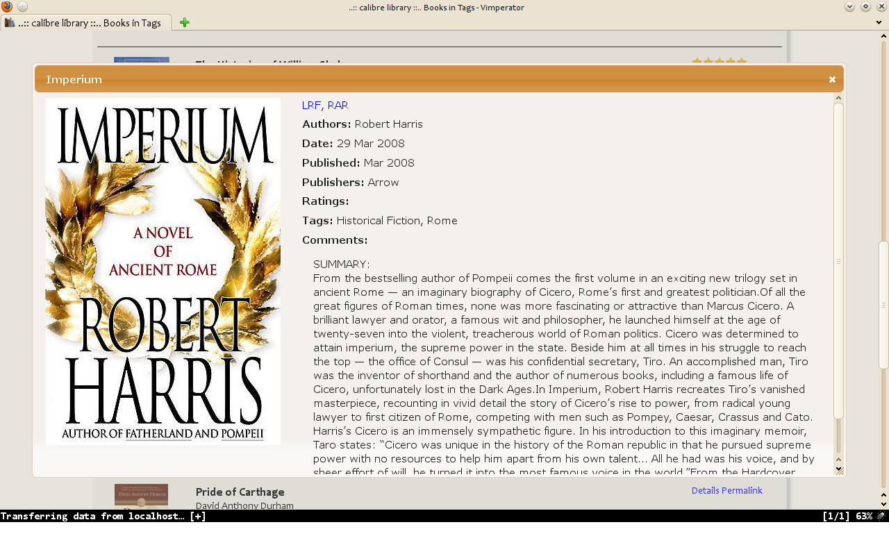 I implemented an all new content server interface in the just released 0.7.24. It allows for browsing by tags/authors/user categories/etc., like the Tag Browser interface in the main calibre GUI. You can access it via /browse, so for example, if you normally access the content server at http://192.168.1.2:8080 you can get the new interface at http://192.168.1.2:8080/browse Some screenshots of the interface are attached. I'm hoping those of you that use the content server will use the new interface and report any problems as I plan on making it the default interface soon. Note that you have to use a fairly modern browser, so no Internet Explorer 6 or 7 in particular. Enjoy. EDIT: And if you really prefer the old interface, it will remain accessible under /old even after this becomes the default interface. |