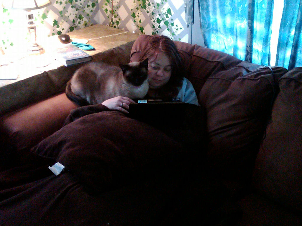 When I sit down with my Sony, Felicity will usually jump in my lap, snuggle in and become a comfortable easel for my reader, with only her whiskers showing at one side, and her tail occasionally swishing from under the other.