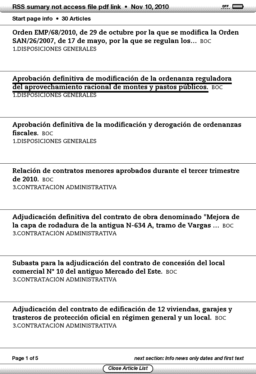 http://www.gobcantabria.es/rss/fichero94.xml http://www.gobcantabria.es/rss/fichero93.xml not indicated that because as I was in another language I just needed "RSS sumary" and if possible "date, year, month, day, leaving only a code, but did not want to read a pdf, "unless you can translate" the first paragraph to mobi format, I guess that would be necessary to deploy software Calibre. but "perhaps avoid, read the pdf you can get"? recipe basic: Spoiler: