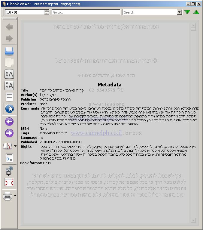 Finally, the Hebrew eBook market shows some signs of awakening. Unfortunately, not all reading systems (eReader devices and applications) support Hebrew properly. Hebrew is a Right To Left (RTL) language (like Arabic) and therefore needs a little different treatment. I would like to post in this thread the current status of Hebrew support among various eReaders, reading applications and platforms. I'll try to update it from time to time. If you have a device that is not listed here, you are welcome to check and post the results. My main focus is on the ePub format. However, I also tested Kindle with mobi ebook... Sample Hebrew ePub is attached here as well as a few screen captures of the expected results as seen with Calibre. In addition, any test results for applications and devices listed here are linked to the appropriate post in this thread. Just the latest and up to date result is linked. eReader Devices and applications that support Hebrew Dedicated e-ink eReaders: 1) Amazon Kindle (3rd generation and above) - kneidlach site 2) PocketBook devices (using FBreader) - Test Results 3) eVrit - a dedicated Hebrew eReader based on Qisda QD060B00 4) PAGEone by Next Papyrus - a Korean eReader, possibly with a firmware update for the Israeli market - Test results. 5) Rooted Nook Simple Touch with Android reading app that supports Hebrew. 6) Rooted Sony PRS-T1 with Android reading app that supports Hebrew. - See details 7) Onyx Boox X61S (using FBReader) with a dedicated (Polish) firmware - Test results 8) Spring Design Alex (possibly with a firmware update by Newpan for the Israeli market ). Tablets and smartphones: 1) iPad, iPhone, iPod (using Stanza or iBooks) - Test results 2) Samsung Galaxy Tab, Motorola XOOM and any other Android Tablet using a capable reading application. Applications: 1) EPUBReader add on for Firefox 2) Calibre (On PC or Mac) 3) FBReader (On PC) 4) AZARDI 6 (On PC, Mac and Linux) - Test Results 5) Aldiko for Android up to Version 1.2 only!!! - Test results 6) Moon+ Reader for Android - Test results 7) OverDrive Media Console (On iOS, Android and Blackberry) 8) Blio Reader for Android. 9) Kobo Reader for Android. 10) Readium extension for Chrome - Test results 11) eBook Reader widget for Opera 12) Bookworm 13) BookGlutton eReader Devices and applications that doesn't support Hebrew ![]() 1) Adobe Digital Editions - Test results 2) Sony Readers - Test results 3) Nook Readers - Test results 4) Kobo Readers - Test results 5) FBReaderJ for Android - Test results 6) Kindle (before the third generation while using valid Hebrew mobi file) 7) BeBook - Test results 8) Foxit eSlick 9) Freda for Windows Mobile 10) iRex 11) JetBook 12) Alex 13) CyBook by Bookeen 14) Aluratek eReaders 15) Aldiko version 2 Below are sample screen captures of valid Hebrew display of the attached ePub: TZR-PedroParamo.epub TZR-PedroParamo.epub Last edited by carmelra; 05-13-2013 at 04:43 PM. Reason: Kindle Hebrew support officially added. |