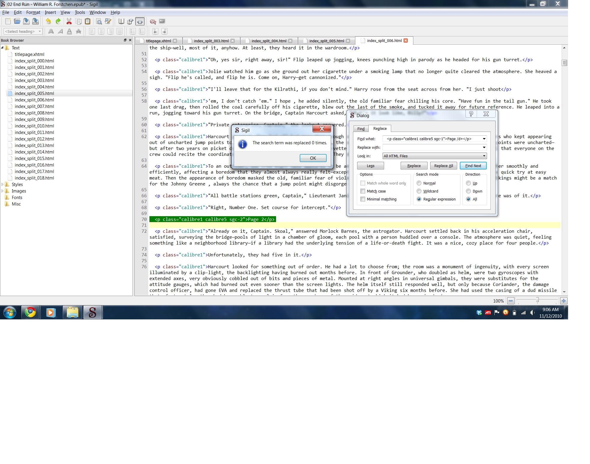 **<p class="calibre1 calibre5 sgc-1">Page 62</p>** But replace 62 with another number automatically. Is there a way to make Sigil search for the string while making the number a wildcard so I can delete them?? Thanks! |