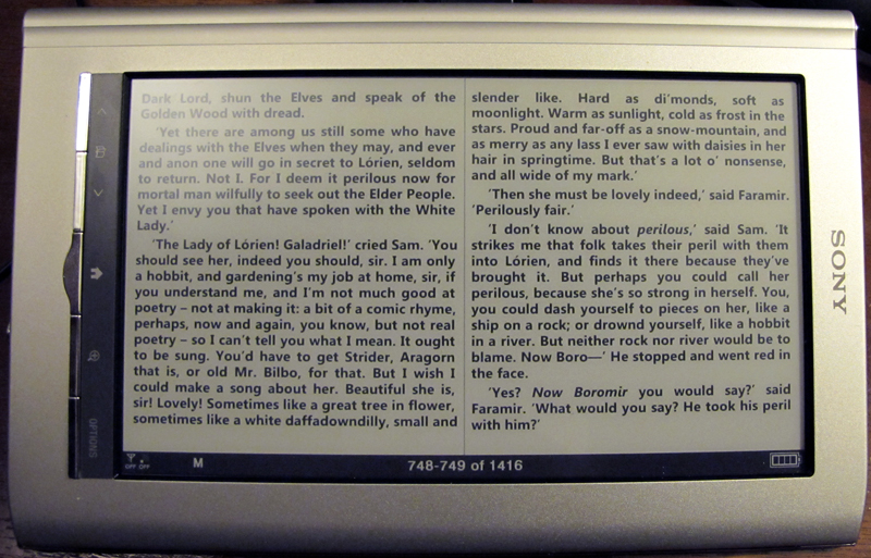 BTW, I'm still miffed at the lousy Sony support, but they will never change I guess! @Bookworm_Girl, Now that I can connect to a PC I won't worry about the WiFi. I seldom use WiFi on my K3 and I probably won't use it much on the 950 either. Eink screens are not the best devices for internet surfing. @SeaBookGuy, the attached photo shows why I like the 950 for reading ePubs in landscape with two column mode. It also shows the customized fonts. I know this is not appealing to everyone, but I like the feel of the 950 in landscape and the look of two columns, and being a lefty I find the buttons easy to use for page turning when I hold it that way. ... Last edited by jswinden; 11-22-2010 at 01:08 AM. |