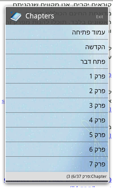 TOC looks great. The words in the text area are displayed properly (every word is readable) but the order of the words is left to right ![]() So, bottom line: It's impossible to read a book with it. This is a disappointment as FBRreader (not the Java version) is working fine with Hebrew. Attached are screen captures: pic 1 - TOC looks great! pic 2 - the words of the text area are displayed in the wrong order. pic 3 - text is displayed with punctuation marks (which seems to be shifted a little to the left of every character) Last edited by carmelra; 11-19-2010 at 04:53 AM. |