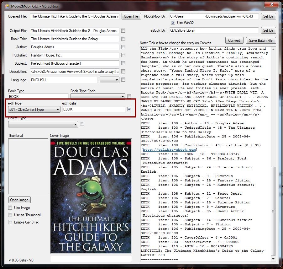 Unfortunately, calibre doesn't allow you to add (or manipulate) the 113 or the 501 EXTH metadata records. Mobi2mobi is the only tool I've found that will allow you to add the proper records to an ebook that doesn't have them. Last edited by DiapDealer; 12-27-2010 at 04:19 PM. |