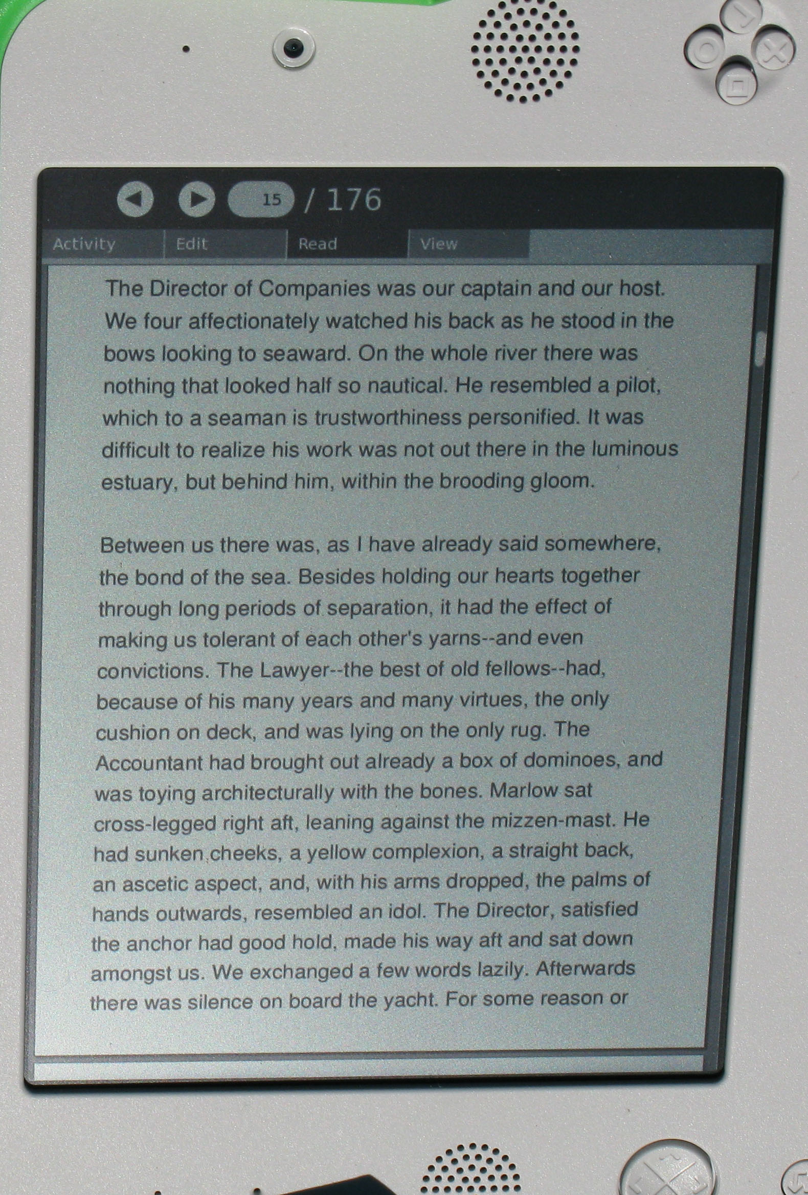 I downloaded “Heart of Darkness” from feedbooks (Iliad version) http://www.feedbooks.com/discover and took another comparison picture – again in bright sunshine but this time with the readers shaded from the direct sun to avoid reflections. Also one would never read in direct sunshine as both the readers and reader would soon be overheated. See Picture3. A few more words about the way the OLPC book reader works might make the situation clearer. When folded as a book reader the OLPC keys and mouse are not available. The only controls are buttons at the side of the display. One side of the display has a rocker button and a single push button. The push button rotates the display to four possible positions that is 2 landscape and 2 portrait. The rocker button scrolls the display up or down. The photograph shows the display in portrait mode, rotation to landscape would show a partial page expanded to fill the width. Four push buttons are contained in a small depression on the other side of the display. One turns to the first page in the book and the opposite button turns to the last page. The two other buttons page by an appropriate amount, up or down, either a full page or a partial page depending on whether the display is in landscape or portrait mode. When rotated back to a laptop the additional menus at the top of the display become available by means of the mouse (touchpad). The newly available menus are Activity, Edit, and View. (see Picture3). Clicking on View displays 4 icons, zoom out, zoom in ,and an icon with a subsidary menu of 3 items, Zoom to width, Zoom to fit and Actual Size. The fourth icon adjusts the size of the display by percentages from 1% on up to ? (the response slows at very high percentages). This icon allows up and down percentage changes. One can make changes in the View mode then click on Read and refold into a book reader. The changes will persist in the book reader. The Activity menu allows one to share the book with others in the “Neighborhood” and the Edit menu opens a small window to type in, for what purpose I don’t yet know. Please don’t take these observations as “truth”. I’m easily confused and I’m not sure that everything is as consistent or logical as I’ve described. For example high lighting menu items can turn the buttons off and I’m not sure what the actual defaults are if the View menu is never used. There may be ways unknown to me to add additional functions to the buttons in Book reader mode. The OLPC comes with no documentation, just a reference to the web site. p. moews |