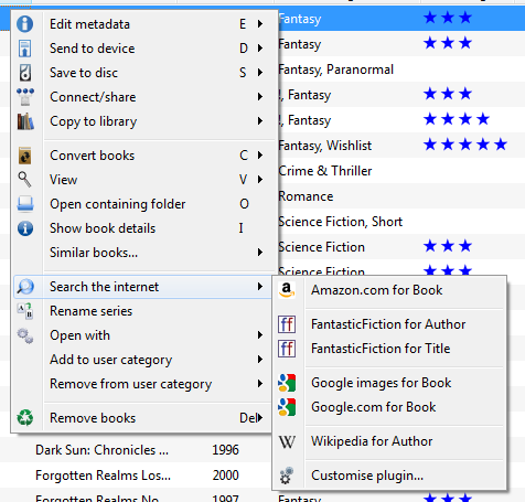 My current alternative to this was to add the option of keyboard shortcuts for each menu item, so at least you didn't have to move the mouse and right-click etc, though you do have to switch focus back to Calibre first of course. I see from your tweak config above (thanks for those btw) that you hadn't as yet upgraded to 1.3 of the plugin I posted last which supports shortcuts. I guess my question to you is once you do have keyboard shortcut ability whether they would assist you sufficiently to not need the feature? EDIT: Sorry, I just looked closer at your URLs and now see you do have keyboard shortcuts configured so are using 1.3. Guess that answers my question about whether you still want the feature ![]() However if others want this feature too (and they respond here soon enough!) then I'm happy to consider it. The difficulty is how to represent this without making it all too complex for everyone who never wants it. One approach that comes to mind is to add a second checkbox column to the grid that you can tick for each row you want to be part of an "Open multiple sites" menu action. This menu action would appear at the bottom of the menu if it had any "members" ticked and would be possible to have it's own keyboard shortcut configured too. As I said if others think it would be useful or have ideas for alternative simpler implementations then speak now...
