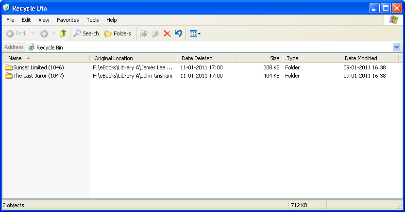 The only thing I did was start calibre. Looked at the Recycle Bin, and there are the 2 books that calibre does not like. Always the same 2 books from library A. The thing is that, it does not happen every time I start calibre, but when it happens, it's always these 2 books from library A. I'm really puzzled. Can it have something to do with the books per se? Edit: What happens when you start calibre? Is there some sanitizing of the db? Because the books not only are not in the db any more. The 2 directories are actually moved to the Recycle Bin. And apparently, it happens fast. Before I could do anything with calibre. Many thanks. Last edited by paulfiera; 01-11-2011 at 12:13 PM. |