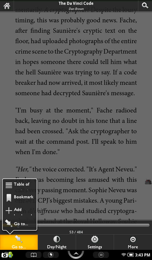 What sets the app apart from Aldiko are textured/fabric backgrounds (love this!), page turns that resemble a physical book (set mine to lowest speed), and the ability to highlight and make notes. You can also export bookmarks, highlights and notes. Oh, one thing that I really wish Aldiko had is the ability to make the text bold/darker (wouldn't be a big deal if I could import fonts). Moon+ Reader has this option and it looks great on textured backgrounds. Edit: Forgot to mention that books must be DRM-free. Last edited by SCION; 01-17-2011 at 01:10 PM. |