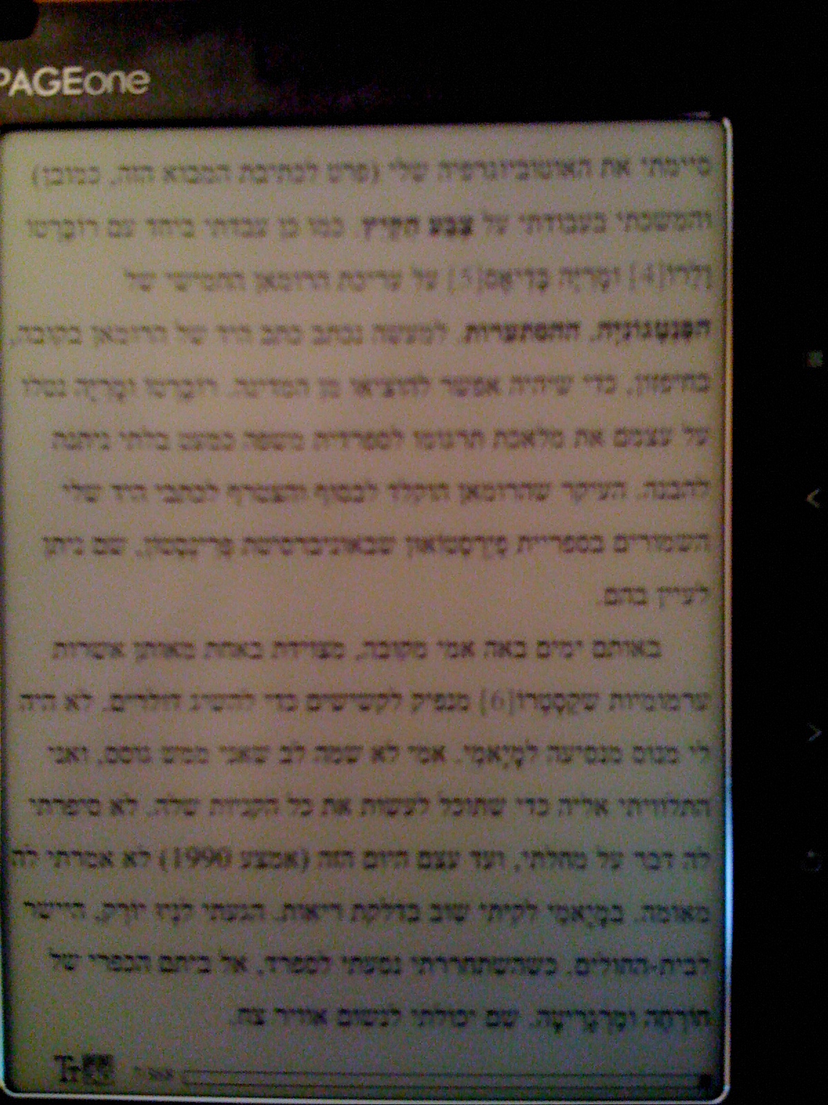 It might be that this reader that is being sold in Israel has a firmware update to enable better Hebrew handling. The following screen captures shows that the erader suppORTS Hebrew properly. Book library is being displayed aligned to the left but the text itself is readable and fine. Book title is being is readable but there is a small problem with some of the text that should be centered and got aligned to the right... Regular text is being displayed properly, including different styles. It's not possible (at least I couldn't find a way) to click on links (for example, for footnotes). Punctuated text is being displayed properly. Just a screen capture to see the device size. I think it's the smallest 6 inch ereader I have ever seen. |