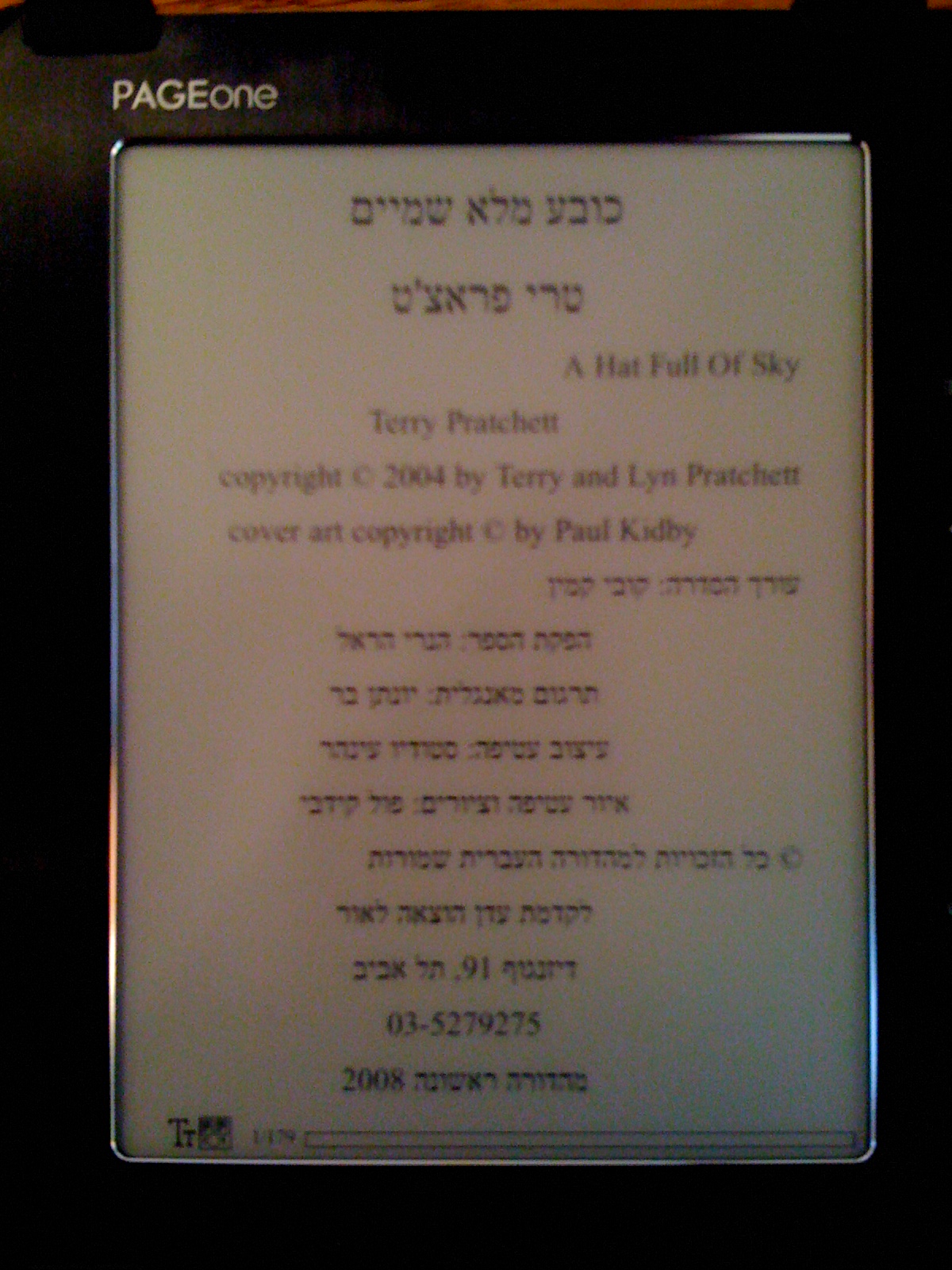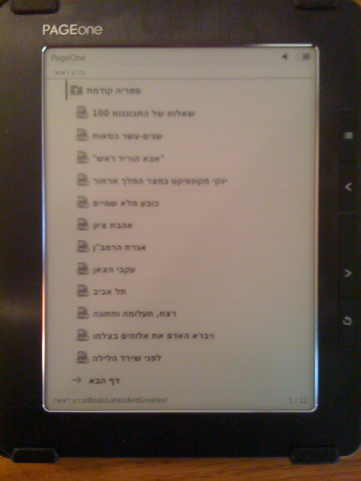 It might be that this reader that is being sold in Israel has a firmware update to enable better Hebrew handling. The following screen captures shows that the erader suppORTS Hebrew properly. Book library is being displayed aligned to the left but the text itself is readable and fine. Book title is being is readable but there is a small problem with some of the text that should be centered and got aligned to the right... Regular text is being displayed properly, including different styles. It's not possible (at least I couldn't find a way) to click on links (for example, for footnotes). Punctuated text is being displayed properly. Just a screen capture to see the device size. I think it's the smallest 6 inch ereader I have ever seen. |