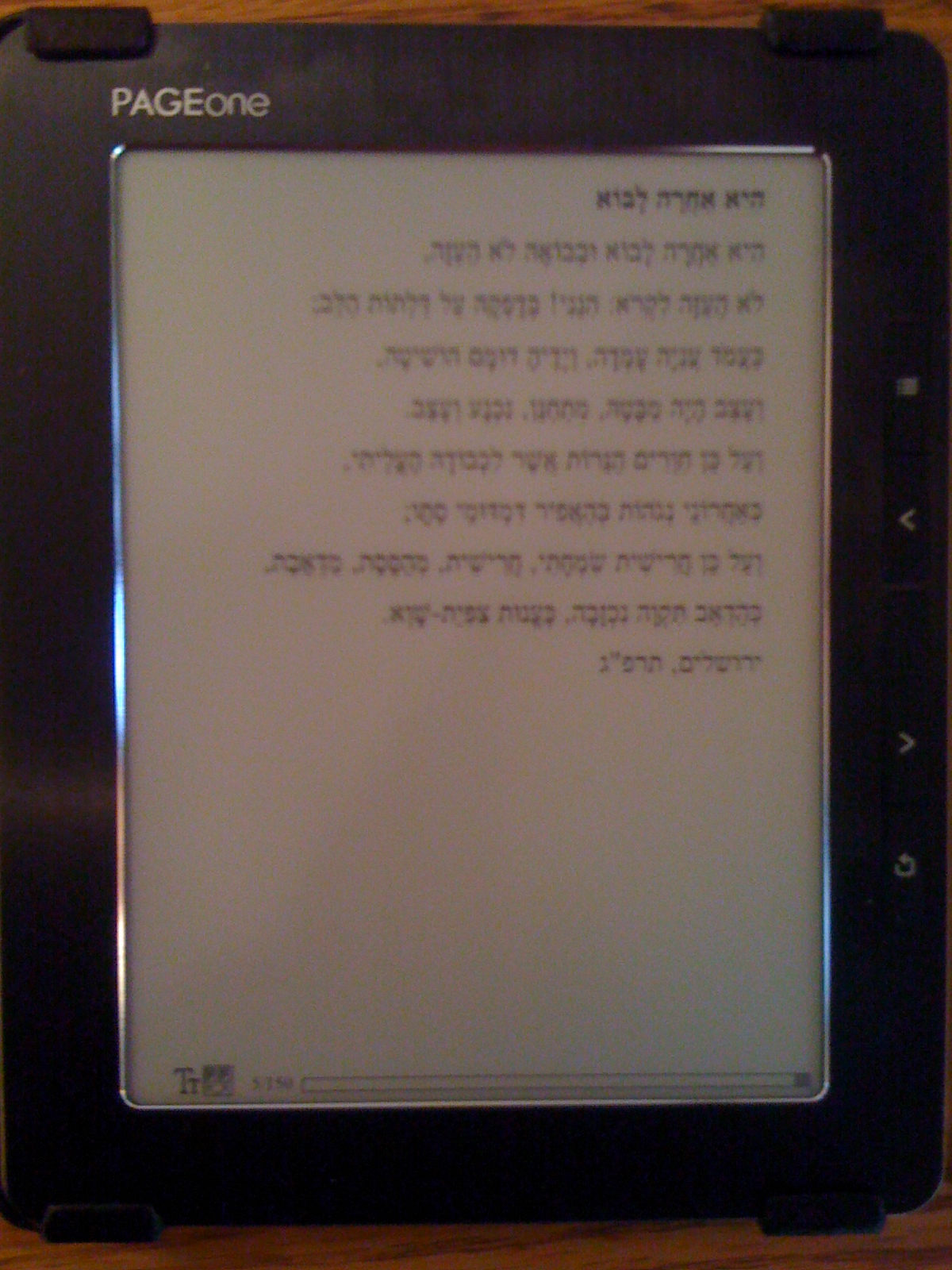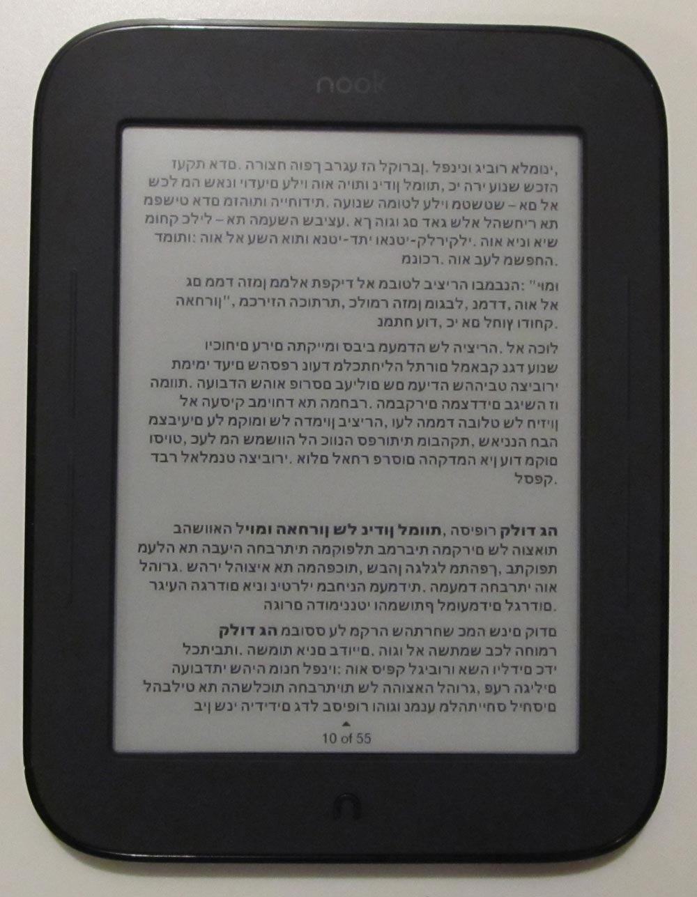 Nathan from the eBook Reader blog posted a review for the new Nook Touch reader. I asked him to check for Hebrew support and he kindly agreed and tested it. The results are not good as you can see from the attached screen captures. The text is displayed left to right and is not readable. In some cases the Nook is unable to deal with some styles and the result is strange characters and symbols.