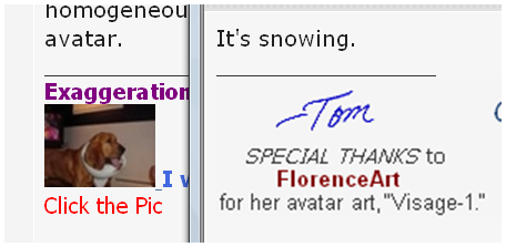 The quotes are, more often than not, picked to reflect my whimsical mood and avoid controversy. Of course it's impossible not to tick someone off now and then. The overall intent, in my signature, is to brighten the day, and hopefully make others smile. And, occasionally (but not so often as to cause mental stress), to give people something to contemplate. As I read the guidelines I can't decide if I've overstepped them or not. Asking for general comments from MR members would be of no use, as some of my friends like only the most innocuous signatures, while I've gotten notes and karma from many who enjoy the thumbnail pictures. And the verdict from the greenies is . . . . . . ? . |