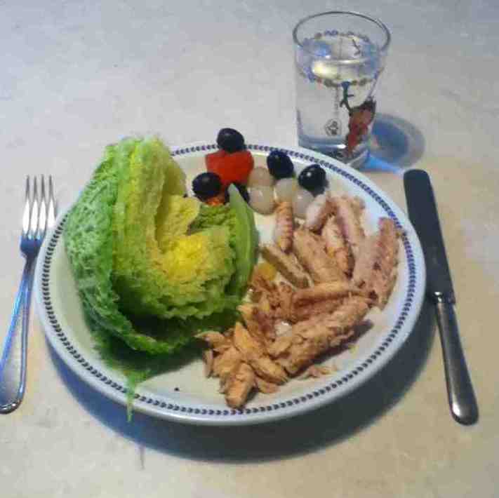 Steamed savoy cabbage and mackerel. Mineral water. Virtue